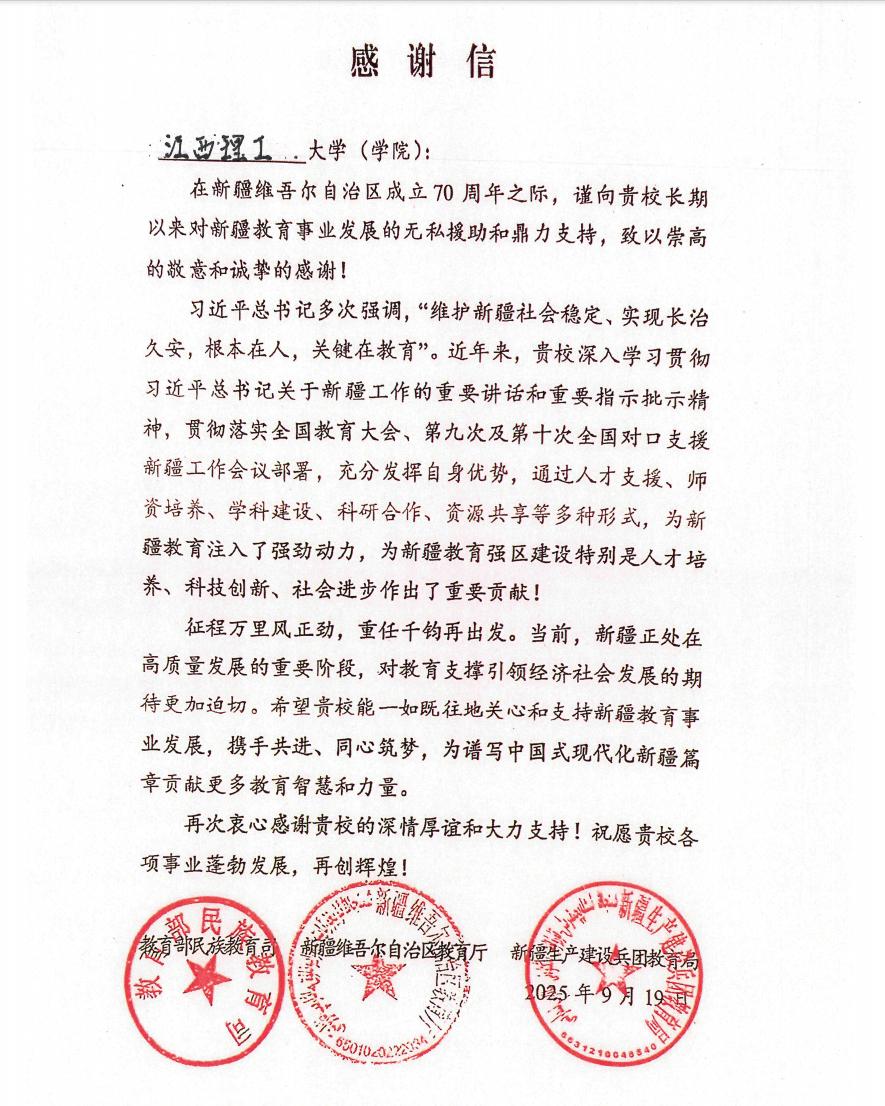 感谢信中写道:江西理工大学校深入贯彻习近平总书记关于新疆工作的重要讲话重要指示批示精神,坚决落实全国教育大会及第九次、第十次全国对口支援新疆工作会议部署,充分发挥学校教育资源与人才优势,通过人才支援、师资培养、学科建设、科研合作、资源共享等多种形式,为新疆教育注入了强劲动力,为新疆教育强区建设特别是人才培养、科技创新、社会进步作出了重要贡献!
