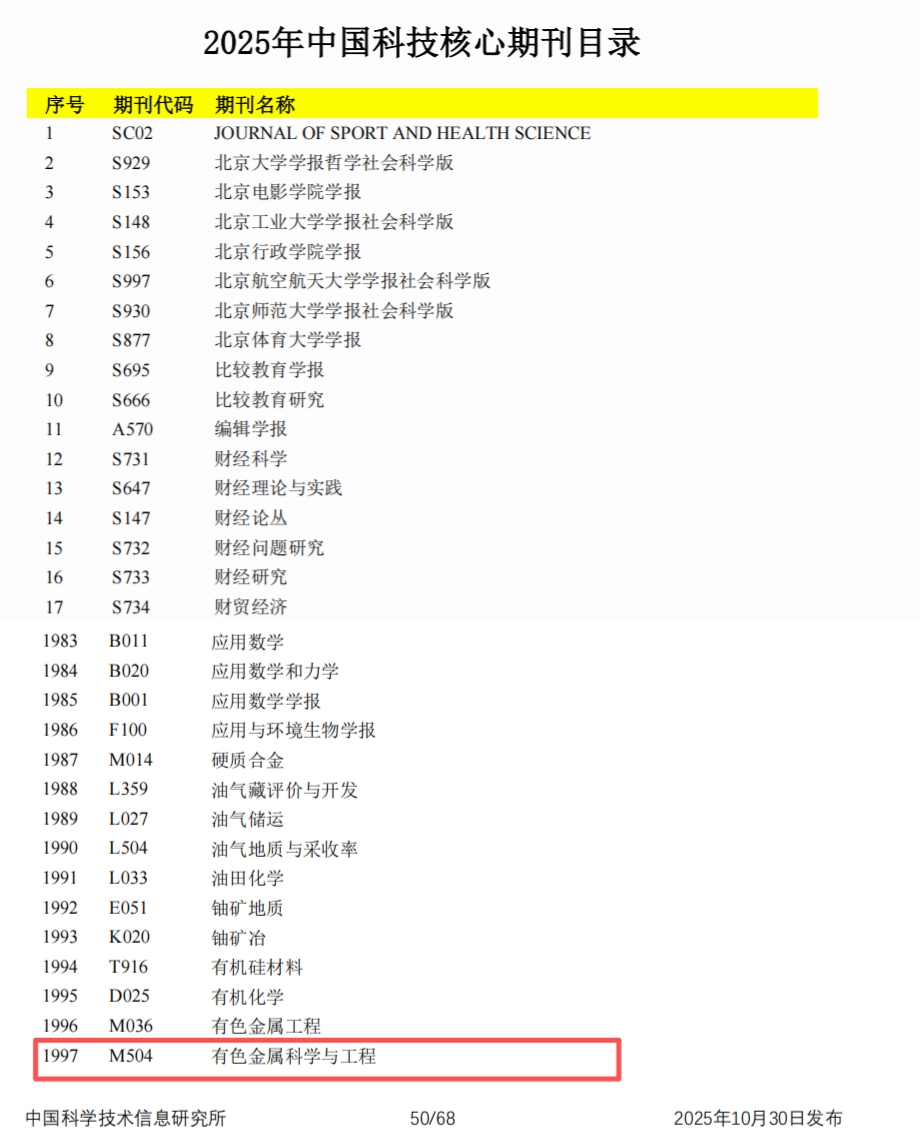 10月30日,由中国科学技术信息研究所承担的“2025年中国科技论文统计报告”在北京发布。报告同期公布了2025年版中国科技核心期刊目录,我校主办的《有色金属科学与工程》成功入选,这是自2013年以来,本刊连续第十三次获此殊荣,体现了期刊在有色金属领域的长期积累与广泛认可。