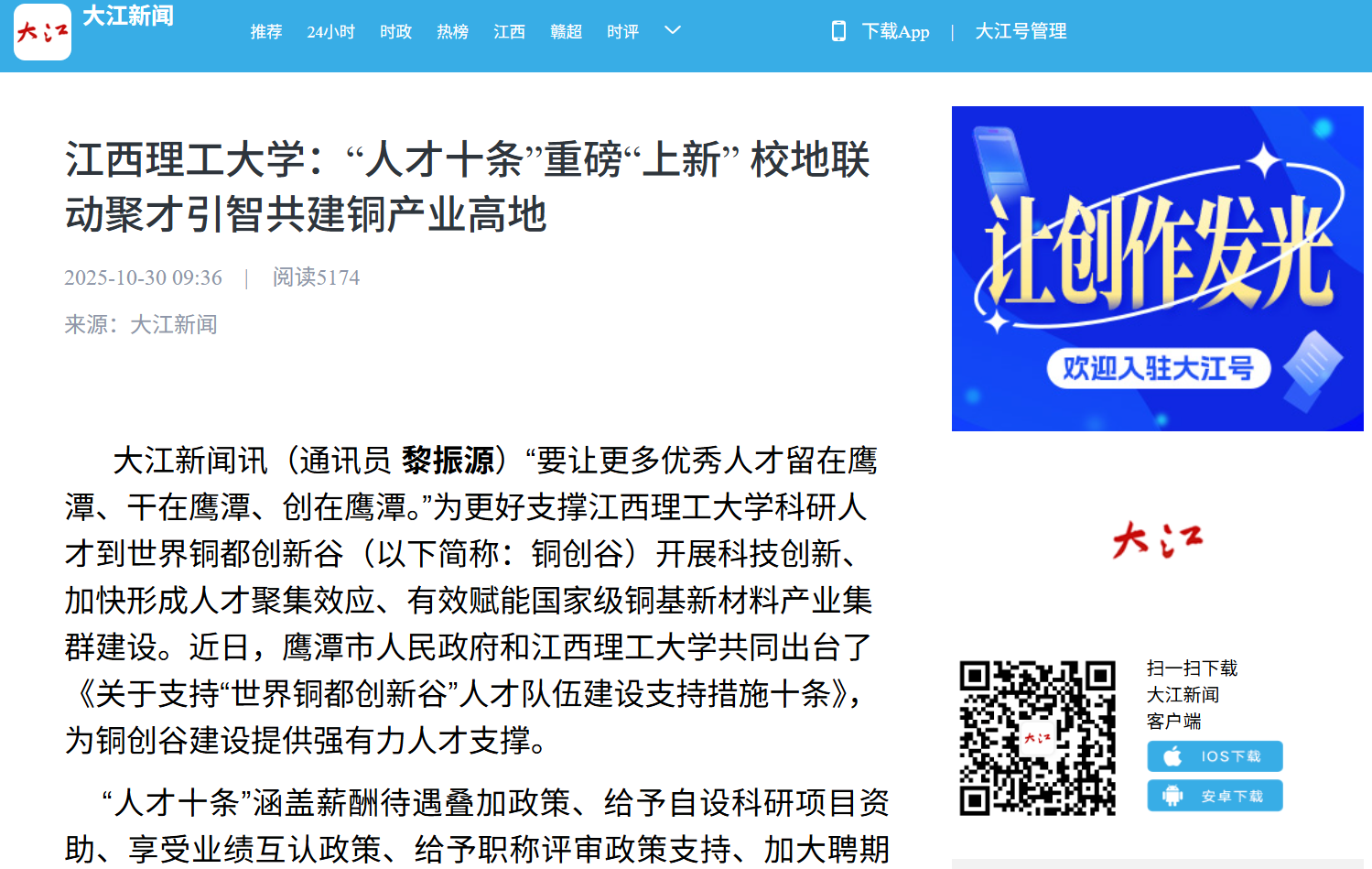 大江新闻讯(通讯员黎振源)“要让更多优秀人才留在鹰潭、干在鹰潭、创在鹰潭。”为更好支撑江西理工大学科研人才到世界铜都创新谷(以下简称:铜创谷)开展科技创新、加快形成人才聚集效应、有效赋能国家级铜基新材料产业集群建设。近日,鹰潭市人民政府和江西理工大学共同出台了《关于支持“世界铜都创新谷”人才队伍建设支持措施十条》,为铜创谷建设提供强有力人才支撑。
