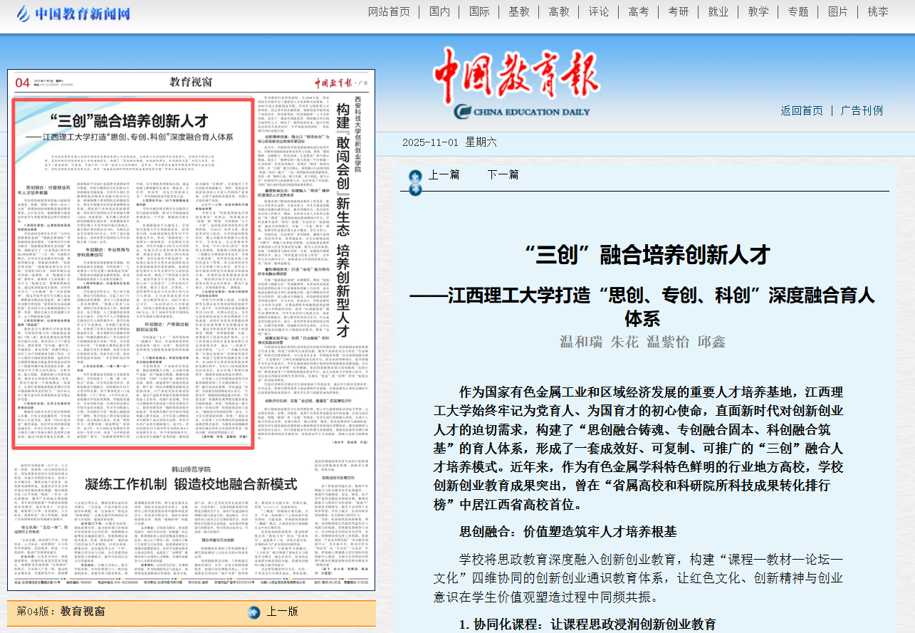 江西理工大学创新创业教育学者温和瑞教授用三个关键词概括了“三创”融合的内在逻辑:学校通过“思创”为魂激发创新创业内生动力,“专创为本”赋能创新创业能力培养,“科创为基”构建科技成果转化服务创业实践的基础,形成“价值塑造—能力培养—实践应用”的创新创业育人范式。“创新是引领发展的第一动力,人才是支撑创新的第一资源。”面向未来,江西理工大学将继续深化创新创业教育模式改革,为服务国家战略需求和区域经济社会发展培养更多“敢闯会创”的高素质创新人才。