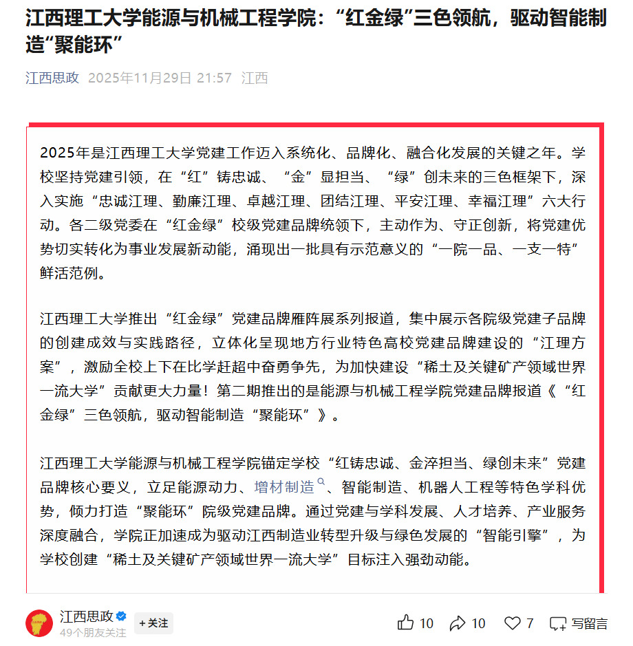 江西理工大学能源与机械工程学院锚定学校“红铸忠诚、金淬担当、绿创未来”党建品牌核心要义,立足能源动力、增材制造、智能制造、机器人工程等特色学科优势,倾力打造“聚能环”院级党建品牌。通过党建与学科发展、人才培养、产业服务深度融合,学院正加速成为驱动江西制造业转型升级与绿色发展的“智能引擎”,为学校创建“稀土及关键矿产领域世界一流大学”目标注入强劲动能。