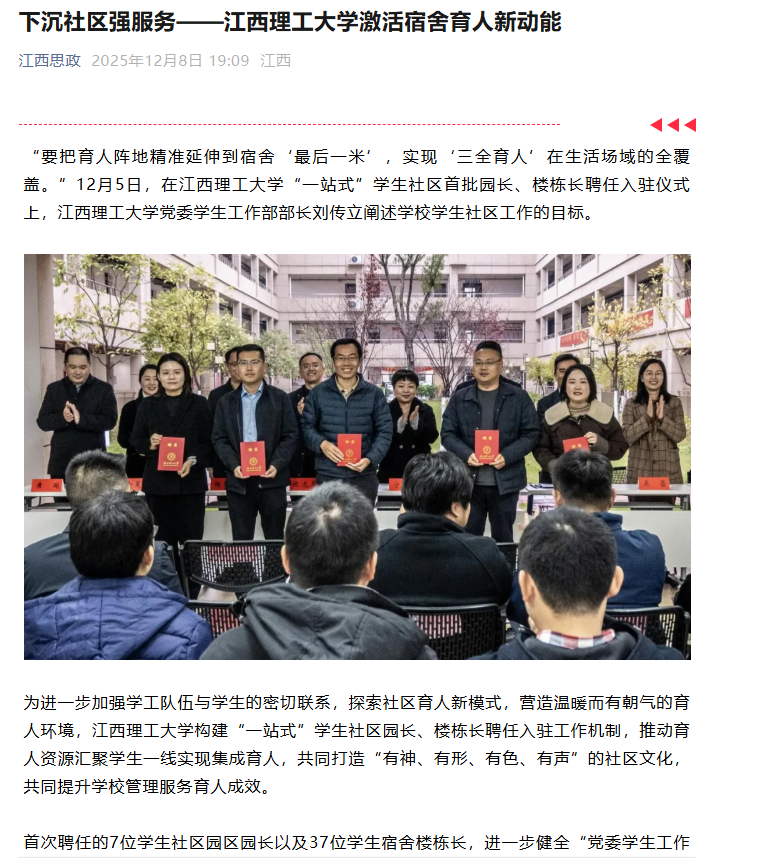 为进一步加强学工队伍与学生的密切联系,探索社区育人新模式,营造温暖而有朝气的育人环境,江西理工大学构建“一站式”学生社区园长、楼栋长聘任入驻工作机制,推动育人资源汇聚学生一线实现集成育人,共同打造“有神、有形、有色、有声”的社区文化,共同提升学校管理服务育人成效。