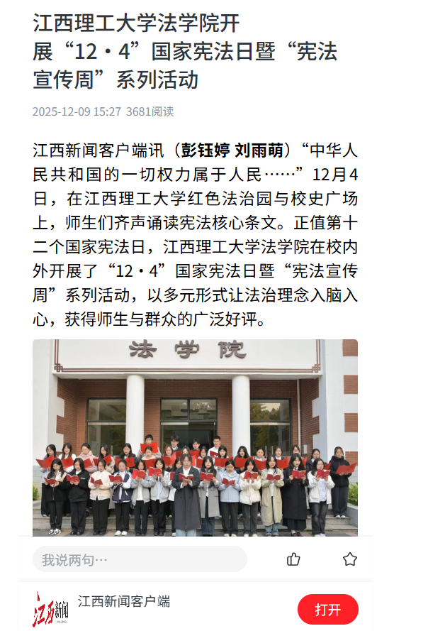江西新闻客户端讯(彭钰婷 刘雨萌)“中华人民共和国的一切权力属于人民……”12月4日,在江西理工大学红色法治园与校史广场上,师生们齐声诵读宪法核心条文。正值第十二个国家宪法日,江西理工大学法学院在校内外开展了“12·4”国家宪法日暨“宪法宣传周”系列活动,以多元形式让法治理念入脑入心,获得师生与群众的广泛好评。