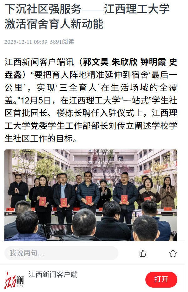 江西理工大学党委常委、副校长宁洁表示,此次社区园长、楼栋长聘任入驻是学校深化学生工作改革的一项重要举措,学校将持续推动学生工作力量下沉一线、扎根社区,紧密结合社区学生所在学科特点、学院特点、社区条件特点加快推进“一站式”成长服务驿站建设,着力把社区打造成集思想引领、学业发展、文化浸润、智慧服务于一体的综合性成长空间,让“一站式”育人功能惠及每一位学子。