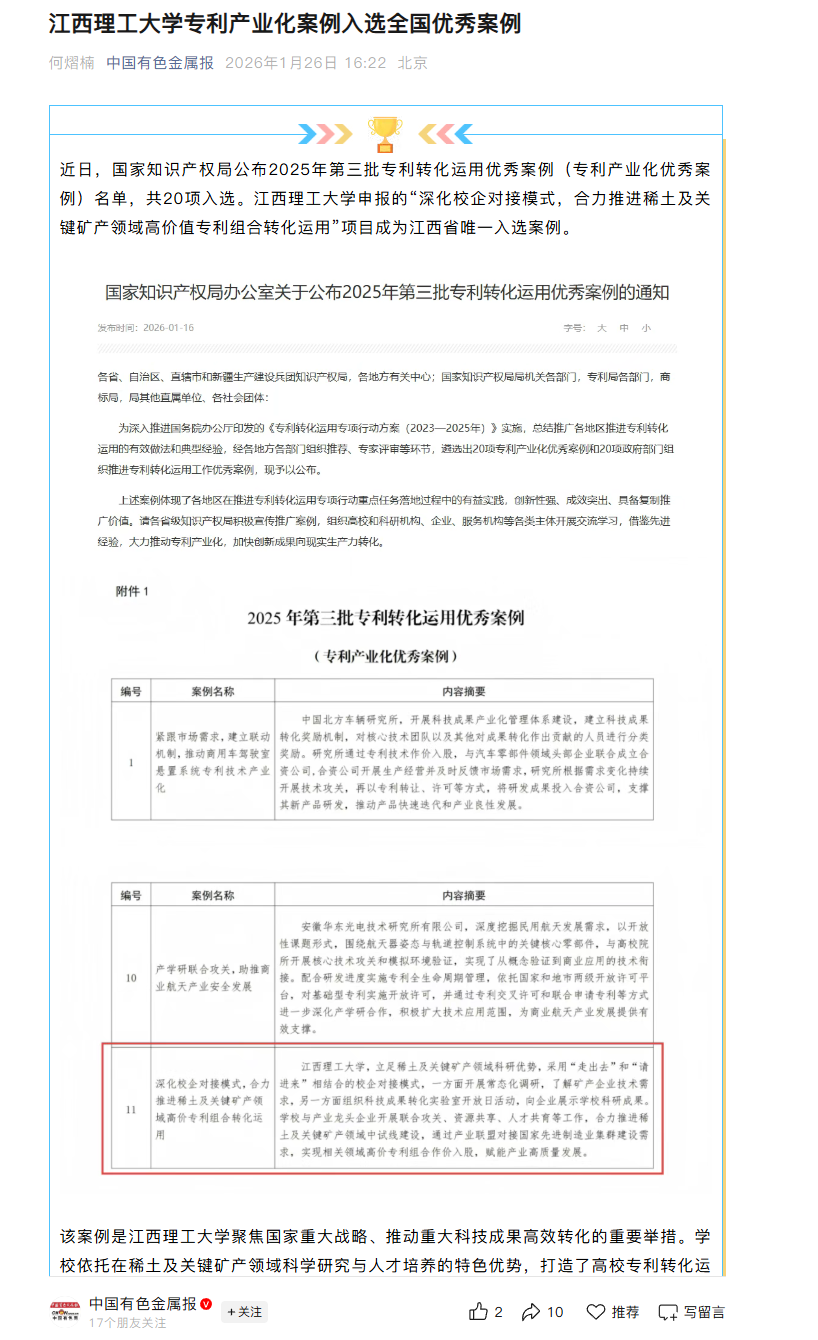 近日,国家知识产权局公布2025年第三批专利转化运用优秀案例(专利产业化优秀案例)名单,共20项入选。江西理工大学申报的“深化校企对接模式,合力推进稀土及关键矿产领域高价值专利组合转化运用”项目成为江西省唯一入选案例。