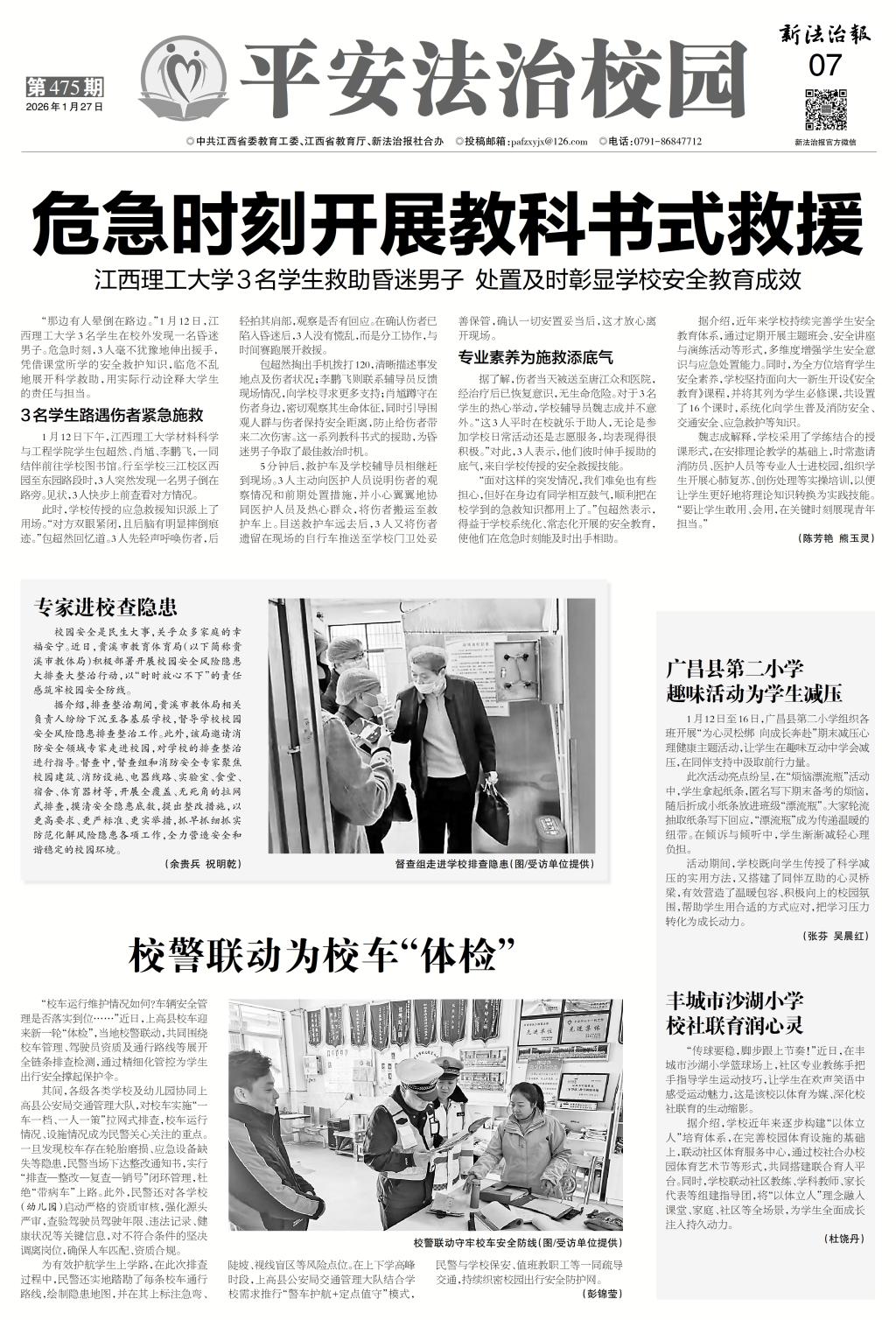 赣法云·新法治报讯(陈芳艳 熊玉灵)“那边有人晕倒在路边。”1月12日,江西理工大学3名学生在校外发现一名昏迷男子。危急时刻,3人毫不犹豫地伸出援手,凭借课堂所学的安全救护知识,临危不乱地展开科学救助,用实际行动诠释大学生的责任与担当。