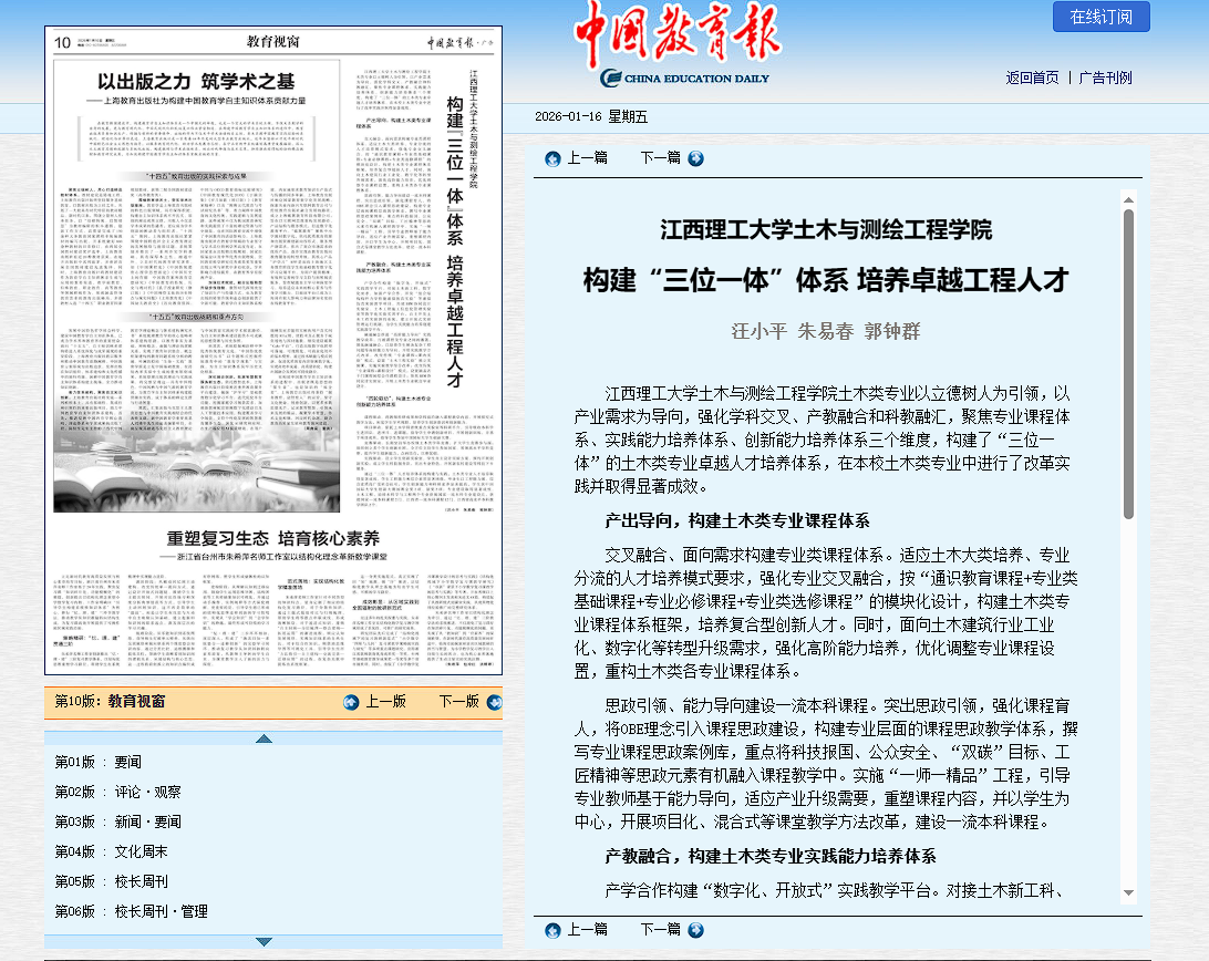 江西理工大学土木与测绘工程学院土木类专业以立德树人为引领,以产业需求为导向,强化学科交叉、产教融合和科教融汇,聚焦专业课程体系、实践能力培养体系、创新能力培养体系三个维度,构建了“三位一体”的土木类专业卓越人才培养体系,在本校土木类专业中进行了改革实践并取得显著成效。