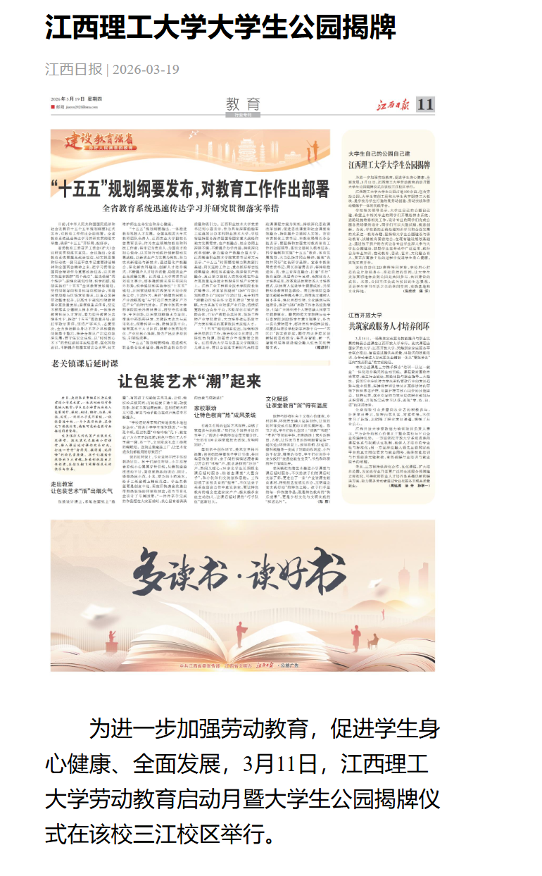 为进一步加强劳动教育,促进学生身心健康、全面发展,3月11日,江西理工大学劳动教育启动月暨大学生公园揭牌仪式在该校三江校区举行。