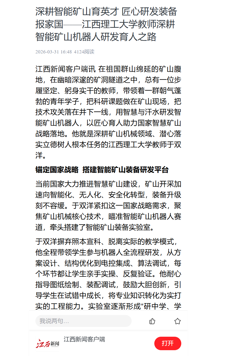 江西新闻客户端讯 在祖国群山绵延的矿山腹地,在幽暗深邃的矿洞隧道之中,总有一位步履坚定、躬身实干的教师,带领着一群朝气蓬勃的青年学子,把科研课题做在矿山现场,把技术攻关落在井下一线,用智慧与汗水研发智能矿山机器人,以匠心育人助力国家智慧矿山战略落地。他就是深耕矿山机械领域、潜心落实立德树人根本任务的江西理工大学教师于双洋。