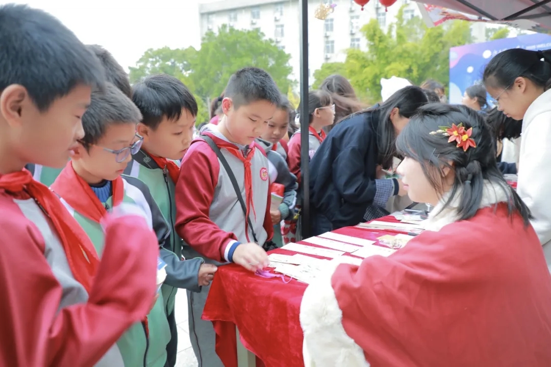 午后暖阳中,这场文化盛宴迎来了一批特别的访客——江西理工大学附属金岭学校的师生们。他们在文化广场合影留念后,便融入这片欢乐的海洋。舞台前,孩子们围坐观看表演,从活力四射的舞蹈到虎虎生风的双截棍表演,都让他们目不转睛。表演结束后,孩子们兴奋地涌入各个展位,在外语互动区跟读单词,在手工区体验异国技艺,清脆的跟读声和完成集章时纯真的笑脸,为这场跨文化之旅增添了一份独特的童趣与生机。
