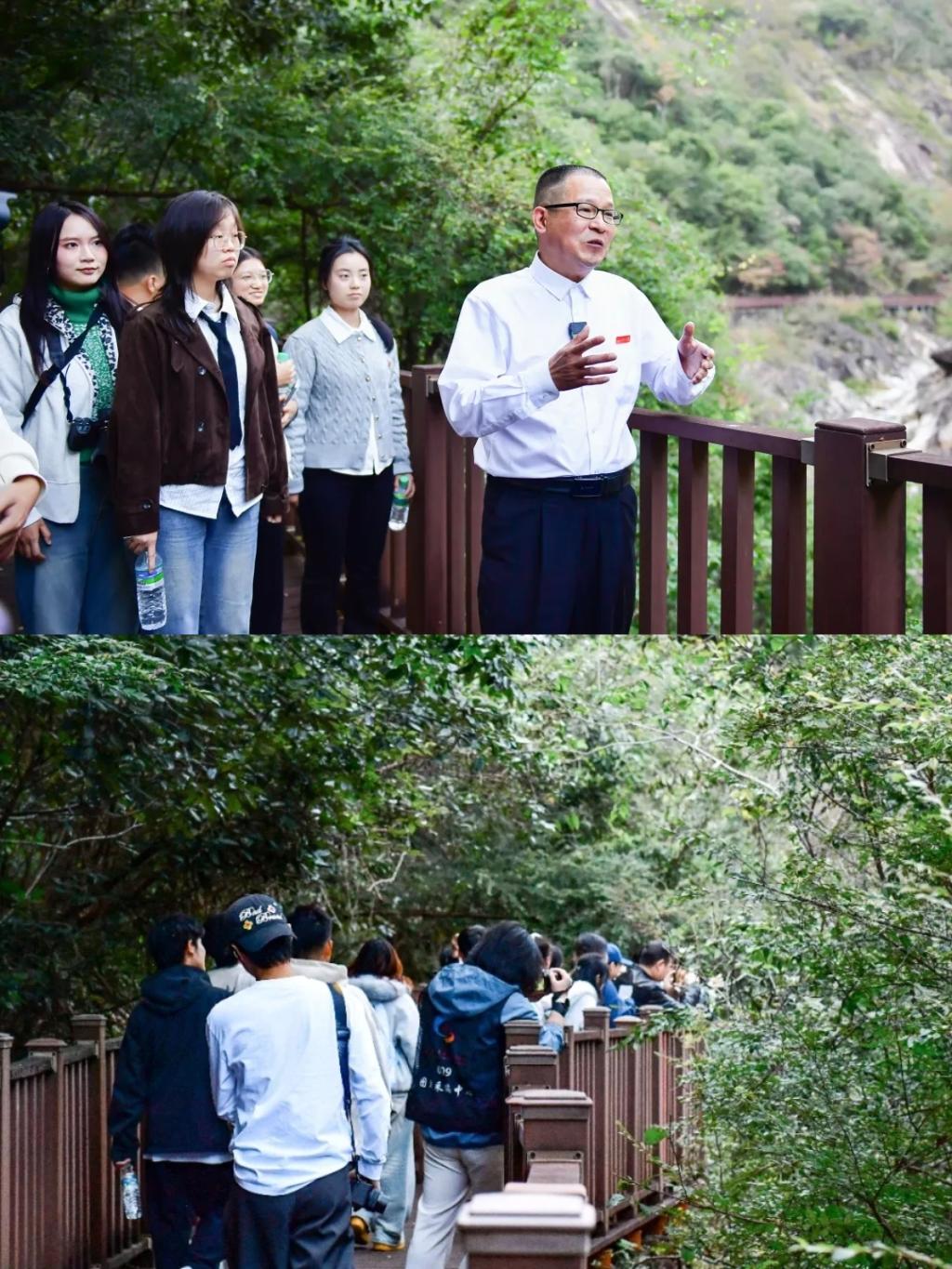 景区讲解员同步介绍着生态保护理念与文明旅游要求,让同学们在欣赏自然之美的同时,树立尊重自然、顺应自然、保护自然的可持续发展意识。途中,师生们在灵泽潭、同心桥等标志性景点开展了拍摄,聚焦瀑布水流、森林植被等细节,记录眼中的自然之美与心灵感悟,用相机定格住“红色文化+绿色生态”的交融瞬间,让革命精神与生态文明的理念同频共振。