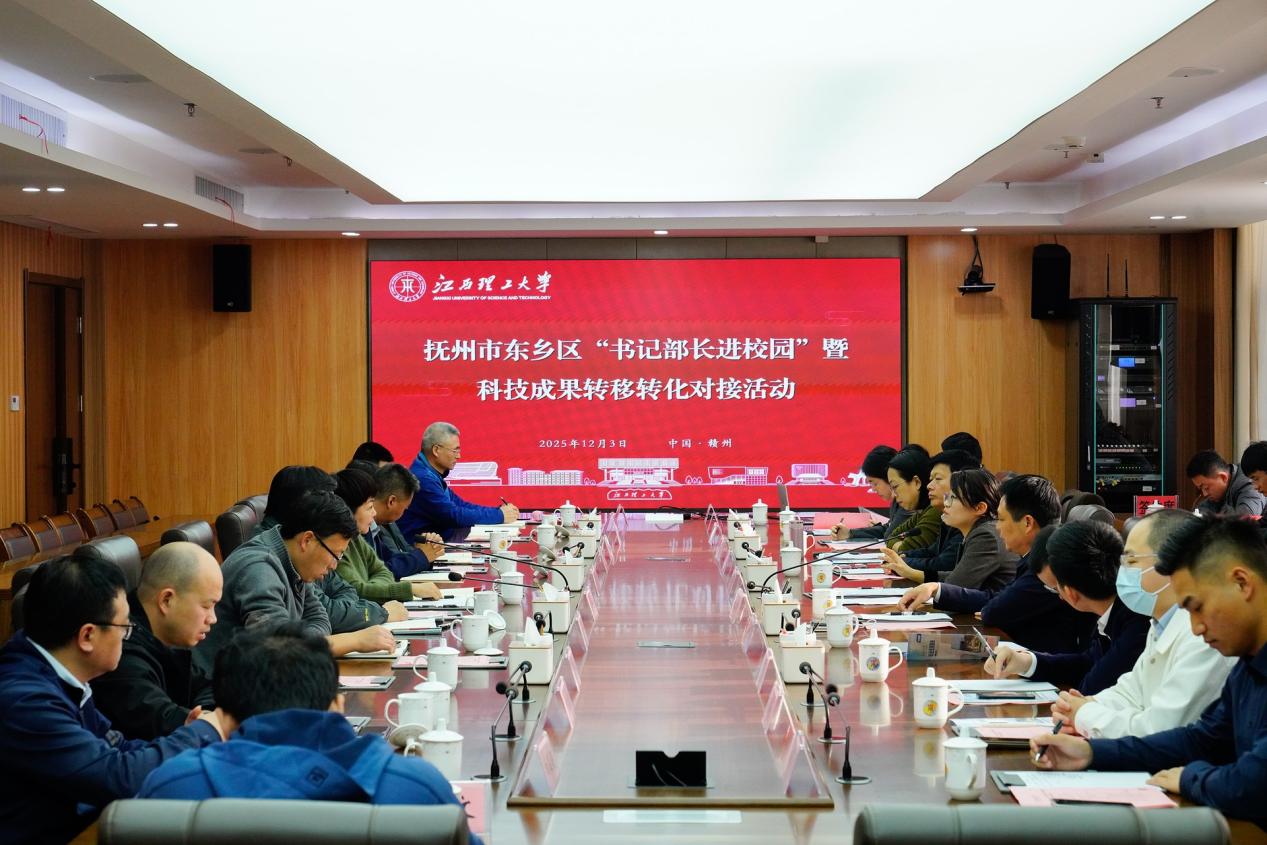 本网讯 12月3日,为推进科技成果转化与产业融合,我校举行抚州东乡区“书记部长进校园”暨科技成果转移转化对接活动,并在三江校区(东园)濂溪楼2号会议室召开座谈会。抚州市东乡区委常委、组织部部长黄娜,抚州市东乡区委统战部常务副部长方学圆,我校党委常委、副校长宁洁,副校长汪航等出席座谈会。会议由校科学技术处副处长聂华平主持。