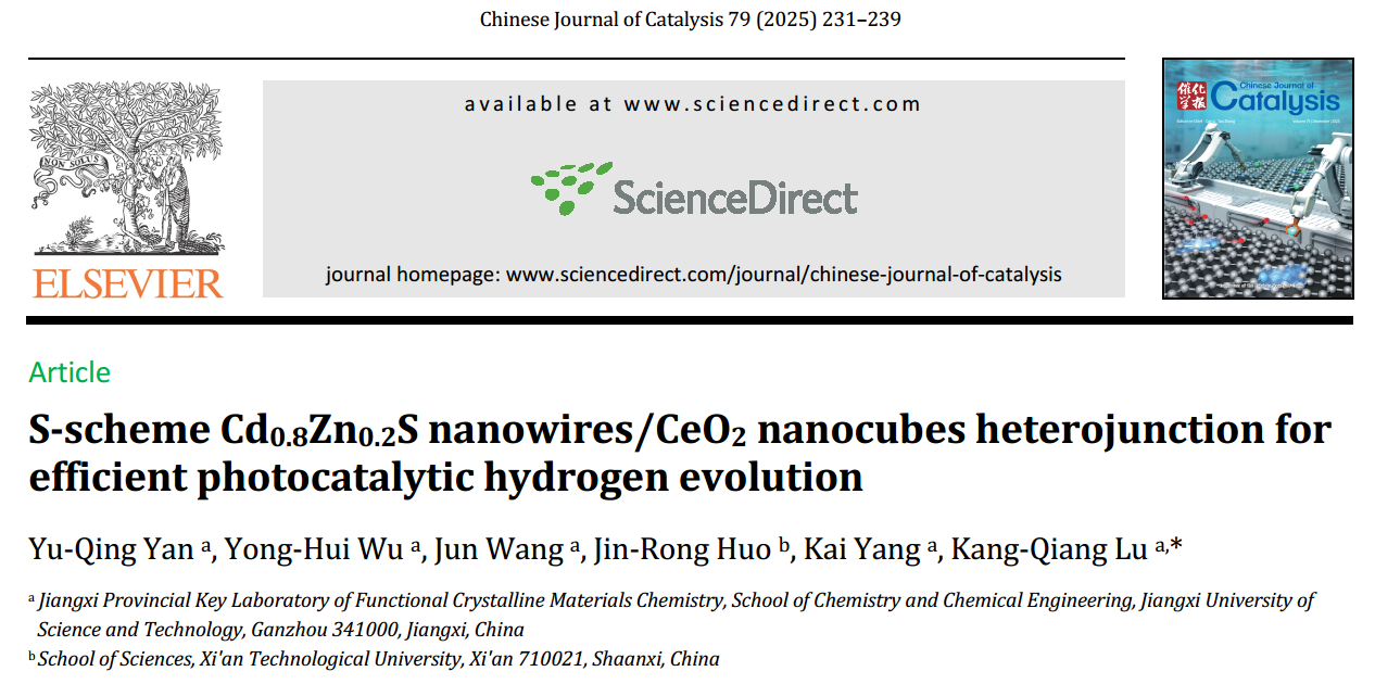 本网讯 近日,我校化学化工学院(功能晶态材料化学江西省重点实验室)卢康强副教授课题组的研究论文“S-scheme Cd0.8Zn0.2S nanowires/CeO2 nanocubes heterojunction for efficient photocatalytic hydrogen evolution”在化学领域权威期刊《Chinese Journal of Catalysis》(SCI一区Top期刊,影响因子17.7)公开发表,论文第一作者为江西理工大学化学化工学院2021级本科生鄢雨晴,论文内容源自其本科毕业论文,通讯作者为卢康强副教授。
