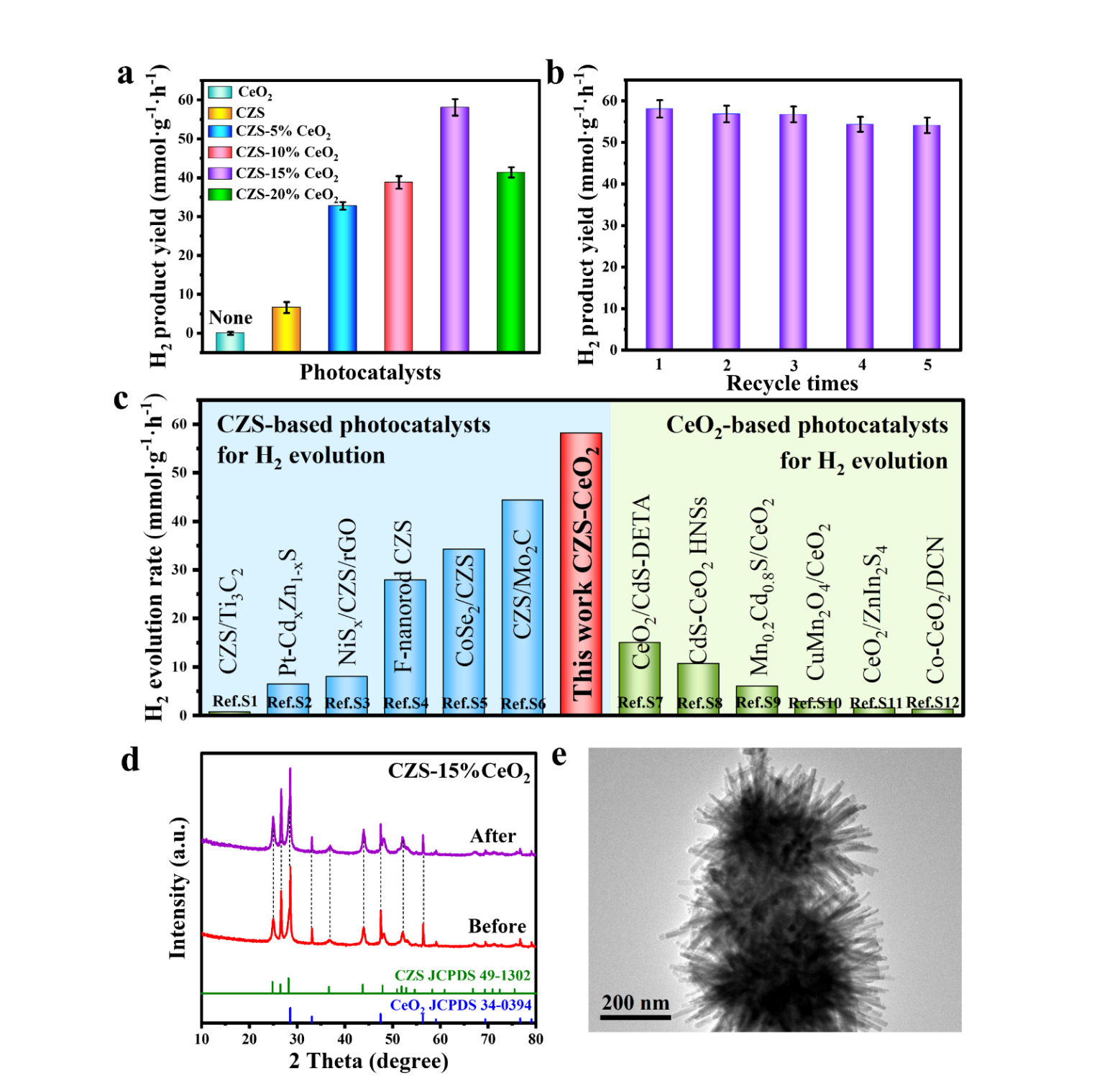 图 3.(a)CZS、CeO2和不同比例的CZS-CeO2复合材料的光催化产氢活性图。(b)CZS-15%CeO2复合材料的光催化产氢稳定性图。(c)CZS-15%CeO2与已报道的其他材料的产氢活性对比图。(d)光催化产氢测试后的CZS-15%CeO2的XRD图谱。(e)催化产氢测试后的CZS-15%CeO2的TEM图像。