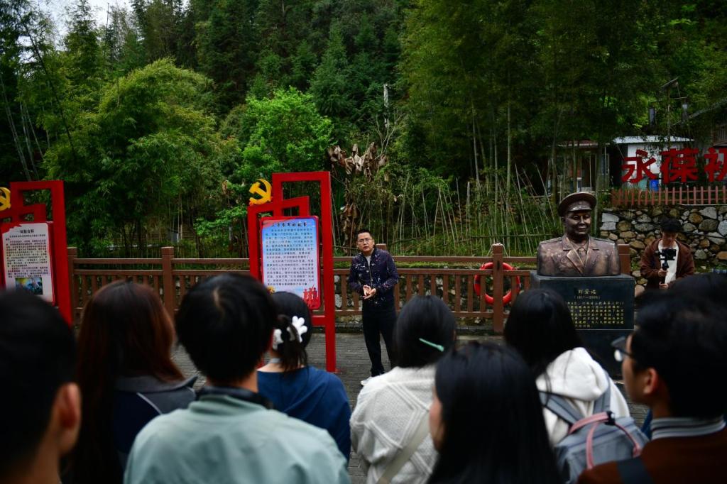 行走在古道之间,师生们在聆听与感悟中深化对革命精神的理解。大家深刻认识到,革命精神的传承从不在于空谈,而在于躬身践行、薪火相继。“脚下的每一块青石板都曾留下革命先辈的坚定步履,身边的每一片山林都曾回荡着革命战士的奋进呐喊,这些鲜活的红色记忆,既是犹崇古道的宝贵财富,更是我们赓续红色血脉、汲取奋进力量的生动教材。”实践队队员、汉教 242 班张汝秋感慨道。