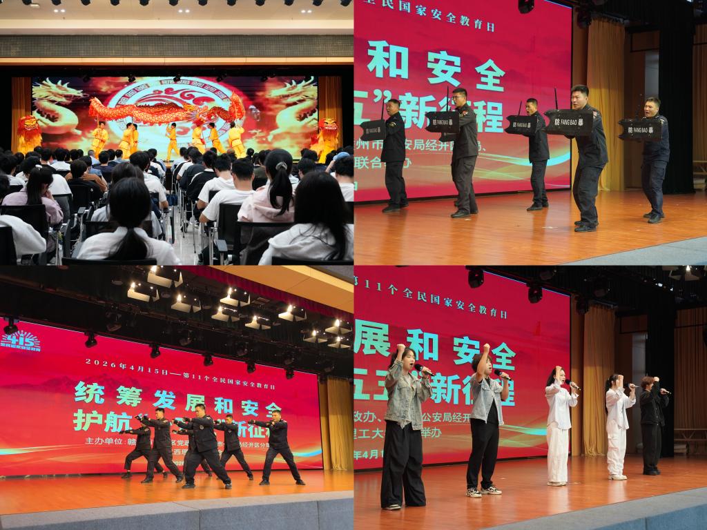 本网讯 为深入贯彻总体国家安全观,增强师生国家安全意识,4月15日上午,我校联合赣州市经开区党政办、赣州市公安局经开分局在三江校区东园三实楼共同举办《统筹发展和安全 护航“十五五”新征程》主题知识竞答活动,活动以“文艺展演+有奖知识抢答”的创新形式,为现场 300 余名师生带来了一堂生动深刻的国家安全“公开课”。